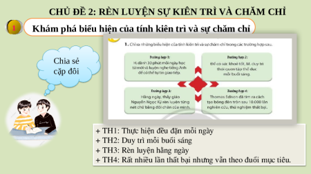 Khám phá biểu hiện của tính kiên trì và sự chăm chỉ Chia sẻ cặp đôi + TH1: Th c ự hi n ệ đ u ề đ n ặ m i ỗ ngày + TH2: Duy trì m i ỗ bu i ổ sáng + TH3: Rèn luy n ệ h n ằ g ngày + TH4: R t ấ nhi u ề l n ầ th t ấ b i ạ nh n ư g v n ẫ theo đu i m ổ c ụ tiêu.