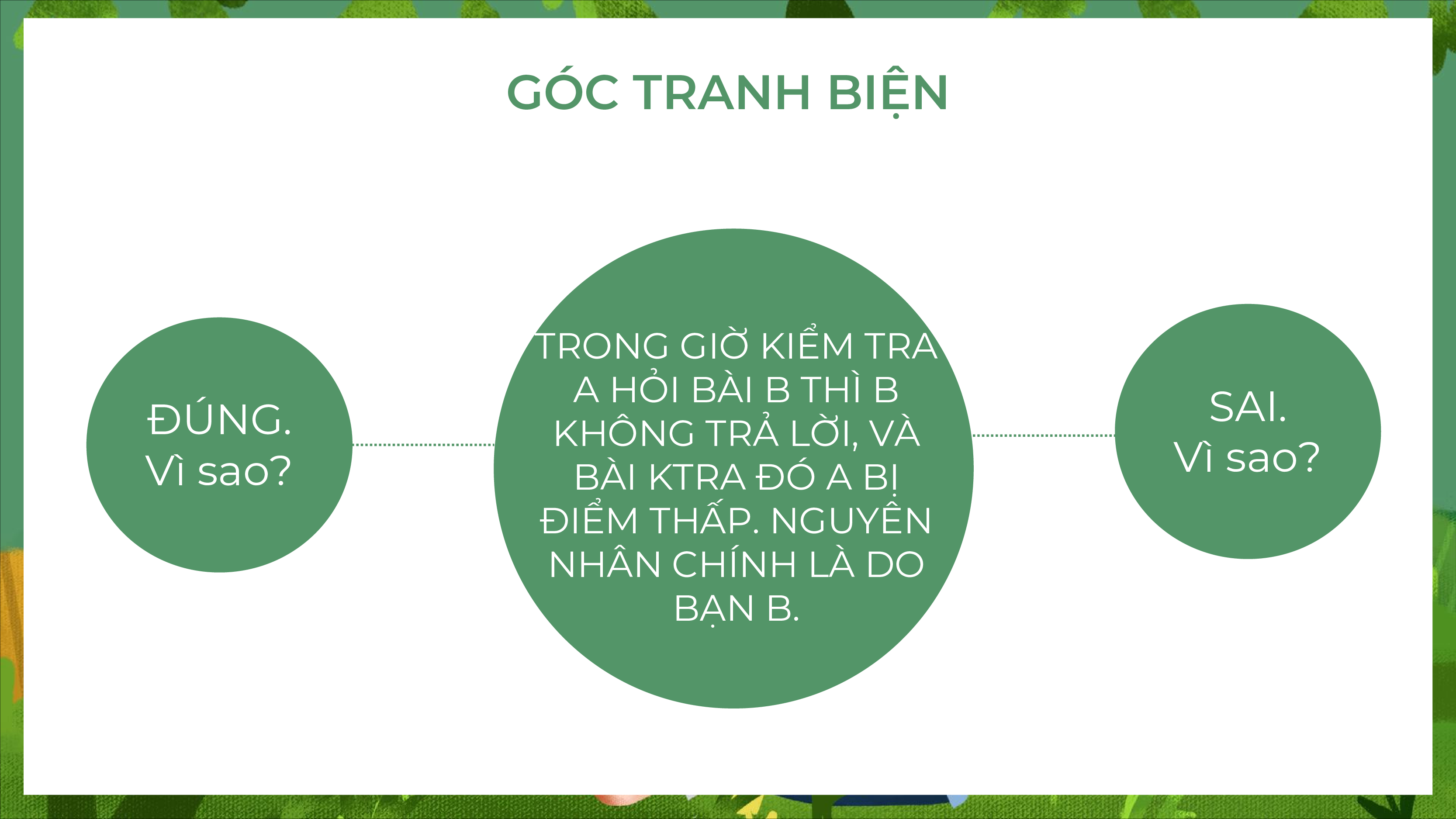 GÓC TRANH BIỆN TRONG GIỜ KIỂM TRA A HỎI BÀI B THÌ B ĐÚNG. SAI. KHÔNG TRẢ LỜI, VÀ Vì sao? BÀI KTRA ĐÓ A BỊ Vì sao? ĐIỂM THẤP. NGUYÊN NHÂN CHÍNH LÀ DO BẠN B. XÂY DỰNG QUAN ĐIỂM SỐNG N H I Ệ M V Ụ 1 T Ì M H I Ể U V Ề Q U A N Đ I Ể M S Ố N G C Ủ A B Ả N T H Â N
