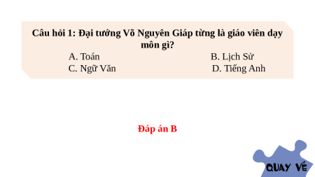 Câu hỏi 1: Đại tướng Võ Nguyên Giáp từng là giáo viên dạy môn gì?