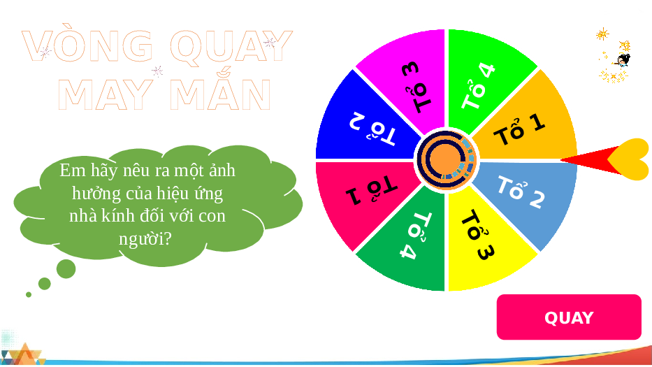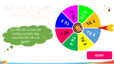 phân tích những ảnh hưởng đó. VÒNG QUAY 3 ổ 4 MAY MẮN T ổ 2 ổ T T Tổ 1 Em hãy nêu ra một ảnh Tổ 1 T hưởng của hiệu ứng T ổ 2 nhà kính đối với con ổ T ổ người? 4 3 QUAY