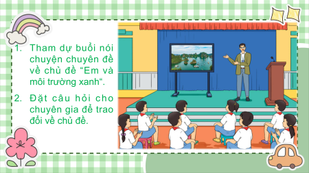 Chủ đề 8 TUẦN 28 Chủ đề 8 Lan tỏa thông điệp “MÔI TRƯỜNG XANH – CUỘC SỐNG XANH” 1. Tham dự buổi nói chuyện chuyên đề về chủ đề “Em và môi trường xanh“. 2. Đặt câu h ỏ i c h o chuyên gia để trao đổi về chủ đề.