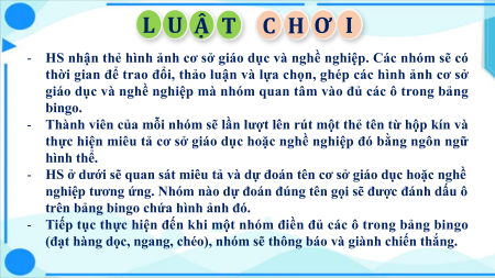 - HS ở dưới sẽ quan sát miêu tả và dự đoán tên cơ sở giáo dục hoặc nghề