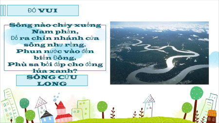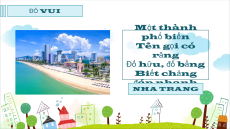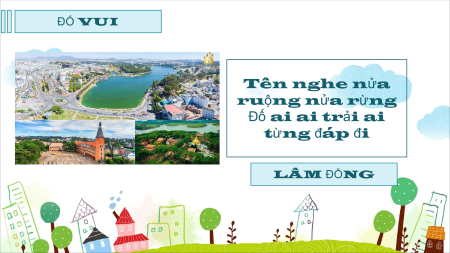 ĐỐ VUI Một thành phố biển Tên gọi có răng Đố hữu, đố bằng Biết chăng đáp nhanh NHA TRANG ĐỐ VUI Tên nghe nửa ruộng nửa rừng Đố ai ai trải ai từng đáp đi LÂM ĐỒNG ĐỐ VUI Sông nào chảy ở trên trời, Ngàn sao hội tụ sáng soi đêm dài? SÔNG NGÂN HÀ ĐỐ VUI Sông nào chảy xuống Nam phần, Đổ ra chín nhánh cửa sông như rồng. Phun nước vào đến biển Đông,
