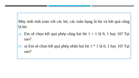 a) Em sẽ chọn kết quả phép cộng hai bit 1 + 1 là 0, 1 hay 10? Tại sao?