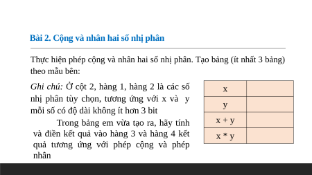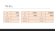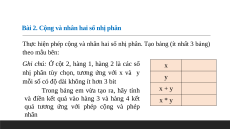 Thực hiện phép cộng và nhân hai số nhị phân. Tạo bảng (ít nhất 3 bảng) theo mẫu bên: