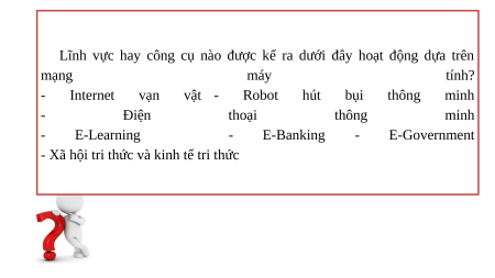 Lĩnh vực hay công cụ nào được kể ra dưới đây hoạt động dựa trên mạng máy tính? - Internet vạn vật - Robot hút bụi thông minh - Điện thoại thông minh - E-Learning - E-Banking - E-Government