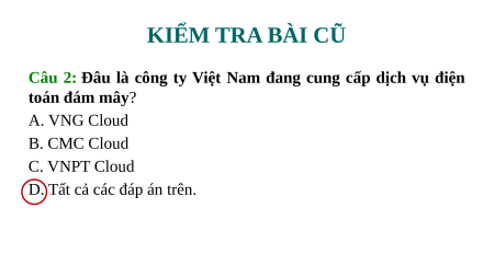 Câu 2: Đâu là công ty Việt Nam đang cung cấp dịch vụ điện toán đám mây? A. VNG Cloud B. CMC Cloud C. VNPT Cloud