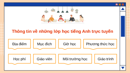 Thông tin về những lớp học tiếng Anh trực tuyến Địa điểm Mục đích Giờ học Phương thức học Học phí Giáo viên Môi trường học Giáo trình BÀI 2: