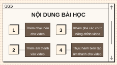 hiệu quả tiếp nhận thông tin của người xem không? BÀI 4: BIÊN TẬP ÂM THANH NỘI DUNG BÀI HỌC 1 Thêm nhạc nền 3 Khám phá các chức cho video năng chỉnh video 2 Thêm âm thanh 4 Thực hành biên tập vào video âm thanh cho video