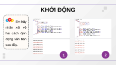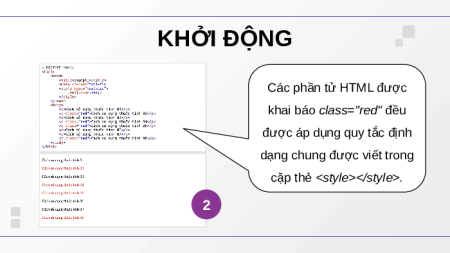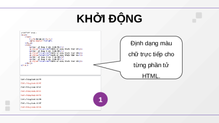 CHÀO ĐÓN CẢ LỚP ĐẾN BUỔI HỌC MỚI! KHỞI ĐỘNG Em hãy nhận xét về hai cách định dạng văn bản sau đây. 1 2 KHỞI ĐỘNG Định dạng màu chữ trực tiếp cho từng phần tử HTML. 1 KHỞI ĐỘNG