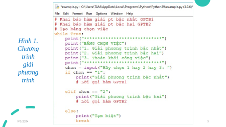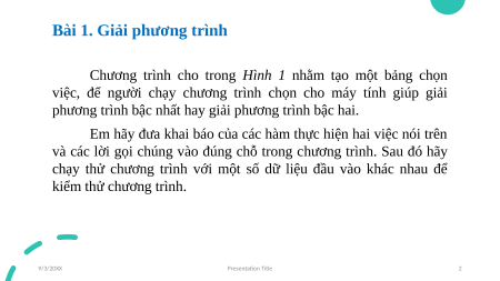chạy thử chương trình với một số dữ liệu đầu vào khác nhau để kiểm thử chương trình. 9/3/20XX Presentation Title 2 Hình 1. Chương trình giải phương trình 9/3/20XX Presentation Title 3 9/3/20XX Presentation Title 4