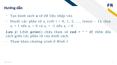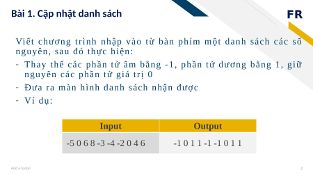 - Đưa ra màn hình danh sách nhận được - Ví dụ: Input Output -5 0 6 8 -3 -4 -2 0 4 6 -1 0 1 1 -1 -1 0 1 1 Add a footer 2 FR Hướng dẫn