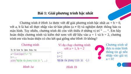 Chương trình ở Hình 1a được viết để giải phương trình bậc nhất ax + b = 0,