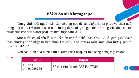 thảo chương trình nhập từ bàn phím hai số a, b và đưa ra màn hình khối lượng gạo tối thiểu cần dự trữ.