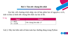 tính và đưa ra hình ước chung lớn nhất của hai số đó. Ví dụ Input Output a = 9855 b = 11556 Ước chung lớn nhất: 27
