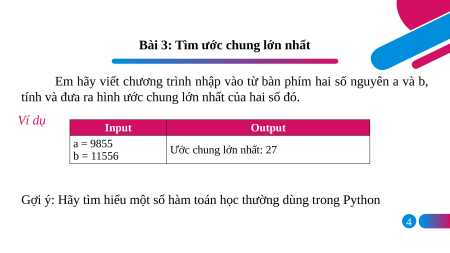 Gợi ý: Hãy tìm hiểu một số hàm toán học thường dùng trong Python 4