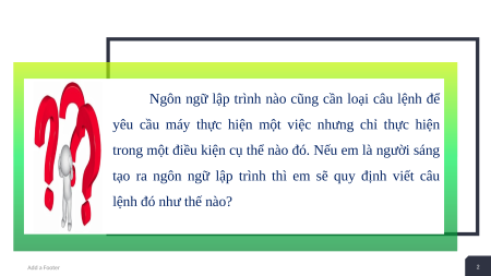 tạo ra ngôn ngữ lập trình thì em sẽ quy định viết câu lệnh đó như thế nào? Add a Footer 2 + 2