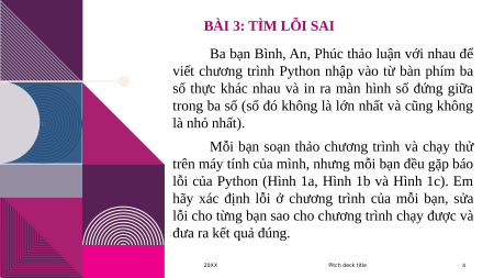 lỗi cho từng bạn sao cho chương trình chạy được và đưa ra kết quả đúng. 20XX Pitch deck title 4