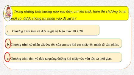 b. Chương trình có nhân vật đọc tên của em sau khi em nhập tên mình từ bàn phím.