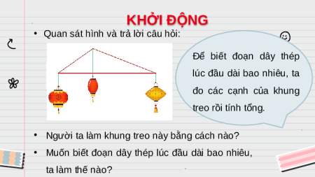 • Quan sát hình và trả lời câu hỏi: N Đ gười ể bi ết ta làm đoạn d kh ây ung thép l tr ú eo c đầ b u ằng dài cách bao nhi uốn êu, ta một đoạ đo các n dây thép cạnh của . khung treo rồi tính tổng.