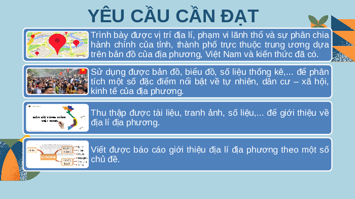 Thu thập được tài liệu, tranh ảnh, số liệu,... để giới thiệu về địa lí địa phương.