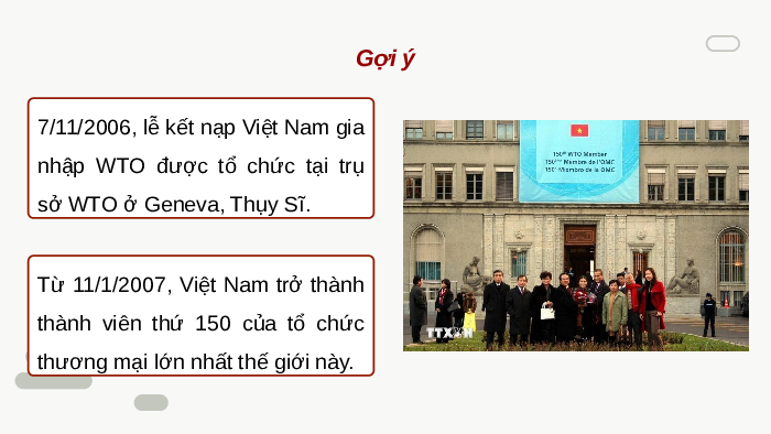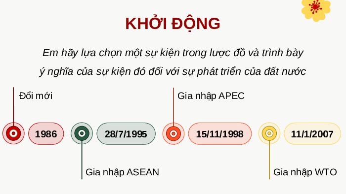 ý nghĩa của sự kiện đó đối với sự phát triển của đất nước Đổi mới Gia nhập APEC 1986 28/7/1995 15/11/1998 11/1/2007 Gia nhập ASEAN Gia nhập WTO Gợi ý