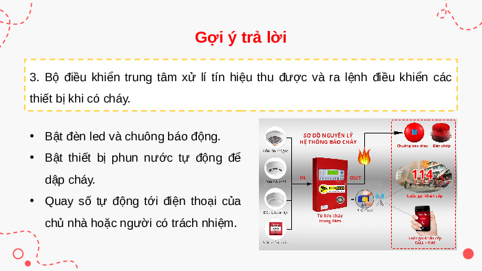 3. Bộ điều khiển trung tâm xử lí tín hiệu thu được và ra lệnh điều khiển các thiết bị khi có cháy.
