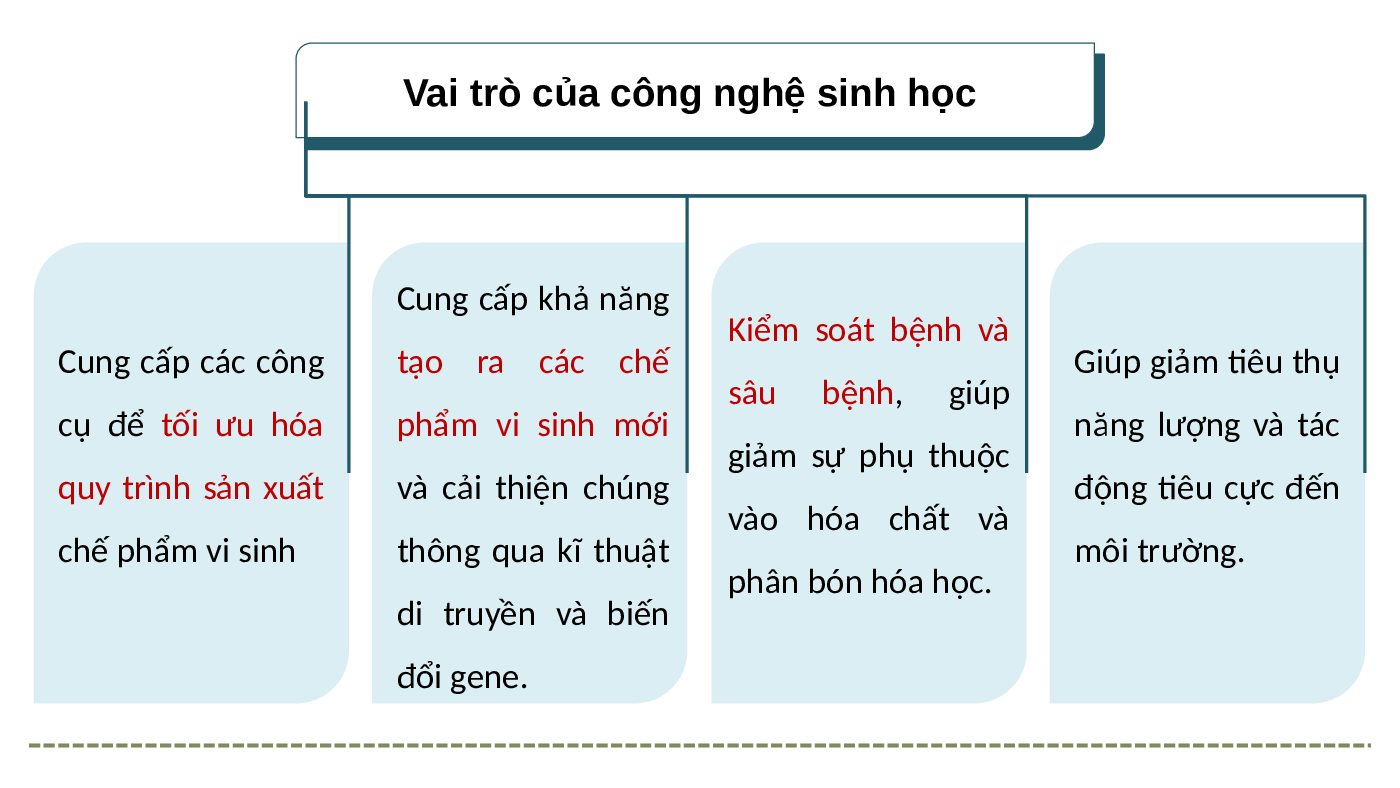 Vai trò của công nghệ sinh học Cung cấp khả năng Kiểm soát bệnh và Cung cấp các công tạo ra các chế Giúp giảm tiêu thụ sâu bệnh, giúp cụ để tối ưu hóa phẩm vi sinh mới năng lượng và tác giảm sự phụ thuộc quy trình sản xuất và cải thiện chúng động tiêu cực đến vào hóa chất và chế phẩm vi sinh thông qua kĩ thuật môi trường. phân bón hóa học. di truyền và biến đổi gene.