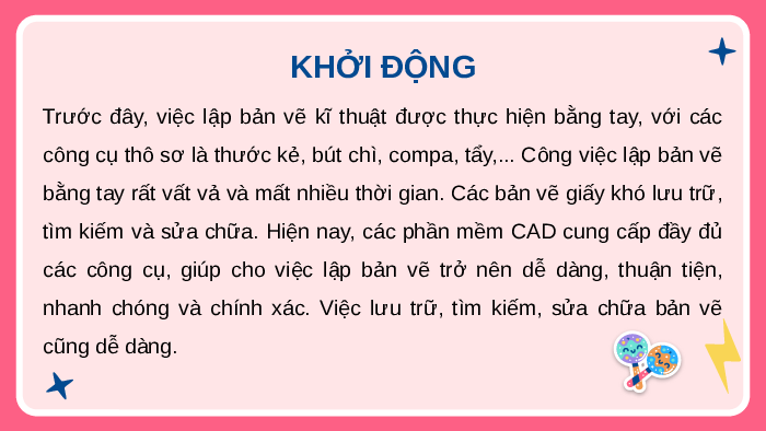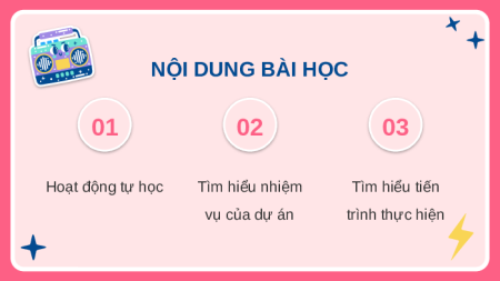 LẬP BẢN VẼ KĨ THUẬT VỚI SỰ TRỢ GIÚP CỦA MÁY TÍNH NỘI DUNG BÀI HỌC 01 02 03 Hoạt động tự học Tìm hiểu nhiệm Tìm hiểu tiến vụ của dự án trình thực hiện