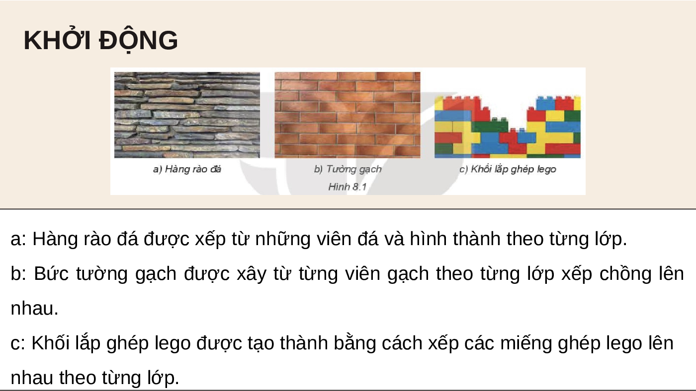 c: Khối lắp ghép lego được tạo thành bằng cách xếp các miếng ghép lego lên nhau theo từng lớp.