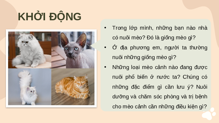 Giáo án Powerpoint Chuyên đề Bài 8: Kĩ thuật nuôi dưỡng và chăm sóc mèo cảnh Công nghệ chăn nuôi 11 Kết nối tri thức