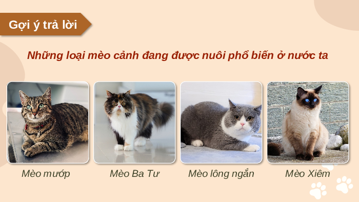 Những loại mèo cảnh đang được nuôi phổ biến ở nước ta Mèo mướp Mèo Ba Tư Mèo lông ngắn Mèo Xiêm Gợi ý trả lời