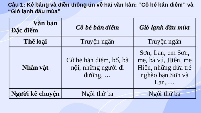 Câu 1: Kẻ bảng và điền thông tin về hai văn bản: “Cô bé bán diêm” và