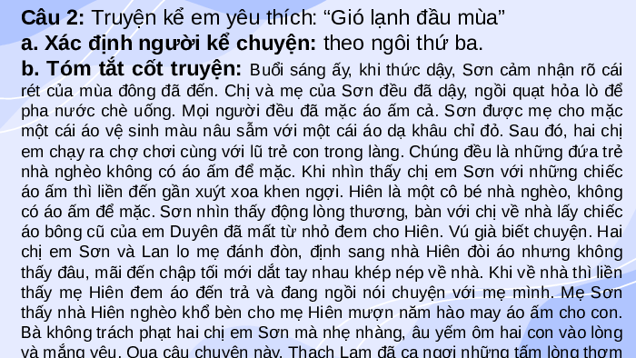 Câu 2: Truyện kể em yêu thích: “Gió lạnh đầu mùa”
