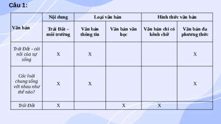 CỦNG CỐ, MỞ RỘNG Câu 1: Nội dung Loại văn bản Hình thức văn bản Văn bản Trái Đất – Văn bản Văn bản văn Văn bản chỉ có Văn bản đa môi trường thông tin học kênh chữ phương thức Trái Đất - cái nôi của sự X X X sống Các loài chung sống X X X với nhau như thế nào? Trái Đất X X X Câu 1: