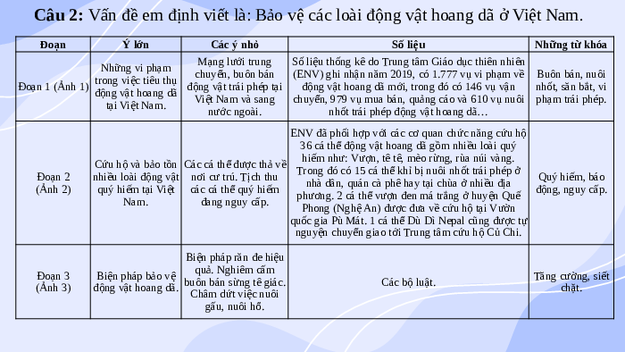Câu 2: Vấn đề em định viết là: Bảo vệ các loài động vật hoang dã ở Việt Nam. Đoạn Ý lớn Các ý nhỏ Số liệu Những từ khóa Những vi phạm Mạng lưới trung