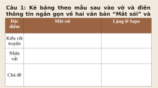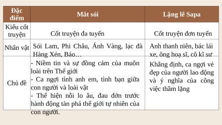 thông tin ngắn gọn về hai văn bản “Mắt sói” và “Lặng lẽ Đặc Sapa” Mắt sói Lặng lẽ Sapa điểm Kiểu cốt truyện Nhân vật Chủ đề