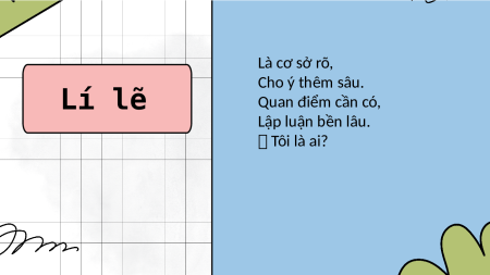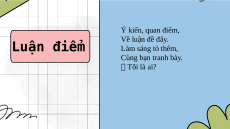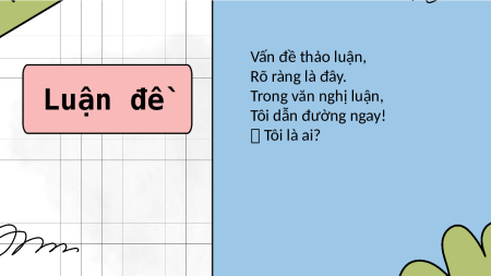 HỌC SINH ĐẾN VỚI BÀI HỌC MỚI NGÀY HÔM NAY! ôi là ai? Vấn đề thảo luận, Rõ ràng là đây. Luận đề Trong văn nghị luận, Tôi dẫn đường ngay! Tôi là ai? Ý kiến, quan điểm, Luận điềm Về luận đề đây. Làm sáng tỏ thêm, Cùng bạn tranh bày. Tôi là ai?