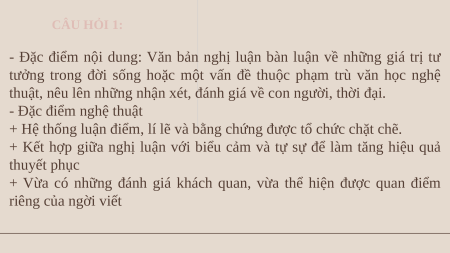 - Đặc điểm nội dung: Văn bản nghị luận bàn luận về những giá trị tư