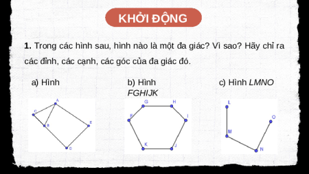 các đỉnh, các cạnh, các góc của đa giác đó. a) Hình b) Hình c) Hình LMNO FGHIJK