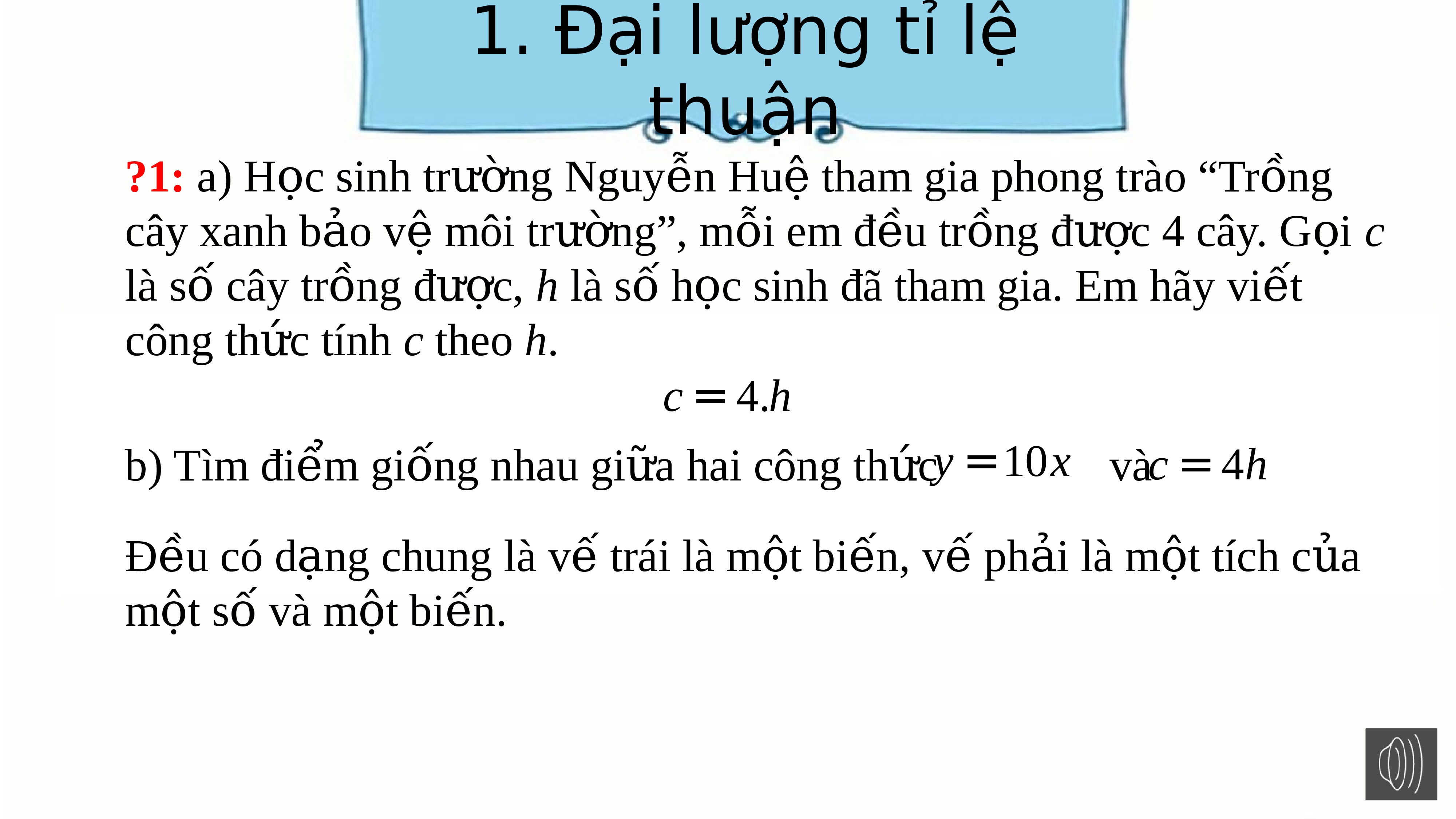 ọ sinh đã tham gia. Em hãy vi t ế công th c tính ứ c theo h. c = 4.h b) Tìm đi m ể gi ng ố nhau gi a ha ữ i công th c ứ y = 10 x và c = 4h Đều có d ng ạ chung là v trái là ế m t bi ộ n, ế v ph ế i ả là m t ộ tích c a ủ một s ố và một bi n. ế 1. Đại lượng tỉ lệ thuận Cho k là h ng ằ s ố khác 0, ta nói đ i ạ lư ng ợ y t ỉ l thu ệ n ậ v i ớ đ i ạ lượng x theo h ệ s ố t ỉl ệ k n u ế y liên h v ệ i ớ x theo công th c ứ y = kx. 1 T ừ y = k x ( k ¹ ) 0 ta suy ra x = y . V y ậ n u ế y t l ỉ thu ệ n v ậ i ớ x theo k 1 h ệ s t ố ỉl
