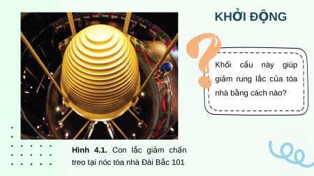 CHÀO M N Ừ G CÁC EM Đ N Ế V I Ớ TI T H Ế C Ọ HÔM NAY! KHỞI Đ N Ộ G Quan sát video về “Con l c ắ gi m ả ch n ấ ” KHỞI Đ N Ộ G Kh i ố cầu này giúp giảm rung l c ắ c a ủ tòa nhà bằng cách nào? Hình 4.1. Con l c ắ giảm chấn treo t i nó ạ c tòa nhà Đài B c ắ 101 BÀI 4 DAO Đ N Ộ G T T Ắ D N. DAO Đ Ầ NG Ộ C N