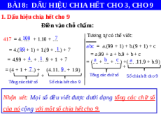 abc = a.(99 + 1) + b.(9 + 1) + c = 4.(.... + 99 1) + 1.(9 + ....) 1 + 7 = a.99 + a + b.9 + b + c = 4.99 + .... + 4 .... .9 + 1 1 + 7 = (. ... a + .... b + ... c.) +(.... a .11.9 + b.9) + = (4 + 1 + .... 7 ) + (4.11. .... 9 + 1.9) + Tổng các chữ số Số chia hết cho 9 Tổng các chữ số Số chia hết cho 9