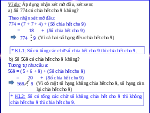* KL1: Số có tổng các chữ số chia hết cho 9 thì chia hết cho 9.