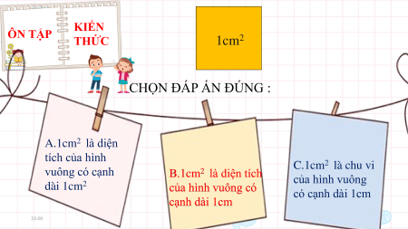 KIẾN ÔN TẬP THỨC 1cm2 CHỌN ĐÁP ÁN ĐÚNG : A.1cm2 là diện tích của hình vuông có cạnh C.1cm2 là chu vi B.1cm2 B.1cm2 là diện tích là diện của hình vuông dài 1cm2 của hìn của h vu h ông có g có cạnh dài 1cm cạnh cạ dài 1cm dài 1cm 23:00