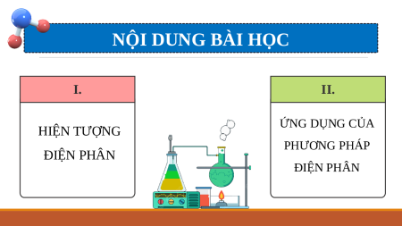 CHƯƠNG 5: PIN ĐIỆN VÀ ĐIỆN PHÂN BÀI 16: ĐIỆN PHÂN NỘI DUNG BÀI HỌC I. II. ỨNG DỤNG CỦA HIỆN TƯỢNG PHƯƠNG PHÁP ĐIỆN PHÂN ĐIỆN PHÂN