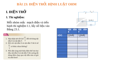 KIỂM TRA THƯỜNG XUYÊN Câu 1: Nêu đ nh ị nghĩa và bi u ể th c ứ xác đ n ị h cư n ờ g đ dò ộ ng đi n . ệ Đáp án: Cư n ờ g đ dò ộ ng đi n l ệ à đ i ạ lư ng ợ đ c ặ tr n ư g cho tác d ng ụ m n ạ h y u c ế a ủ dòng đi n và ệ đư c ợ xác đ nh b ị n ằ g bi u ể th c: ứ q I t Câu 2: Vi t ế bi u t ể h c ứ liên h ệ gi a ữ cư ng ờ đ dò ộ ng đi n t ệ rong dây dẫn kim lo i ạ v i ớ m t ậ đ ộ h t ạ mang đi n ệ và t c ố đ d ộ ch c ị huy n ể có hư ng c ớ a ủ các h t ạ mang đi n ệ : Đáp án: I S nve BÀI 23: ĐI N Ệ TR . Ở Đ N Ị H LU T Ậ OHM BÀI 23: ĐIỆN TR . Ở Đ N Ị H LU T Ậ OHM I. ĐIỆN TRỞ 1. Thí nghi m ệ : M i ỗ nhóm m c ắ m c ạ h đi n và ệ ti n ế hành thí nghi m ệ I.1, l y s ấ l ố i u và ệ o B ng 23.1. ả Vật dẫn Vật dẫn X Y U(V) I (mA) I (mA) 1 2 BÀI 23: ĐIỆN TR . Ở Đ N Ị H LU T Ậ OHM I. ĐIỆN TRỞ 2. Đ n ị h nghĩa đi n ệ tr . ở Đi n t ệ r l ở à đ i ạ lư n ợ g đ c ặ tr ng ư cho m c ứ đ c ộ n t ả r dòng đi ở n ệ của v t ậ d n ẫ . Đi n t ệ r ở kí hi u ệ là R. U R I Đ n v ơ ị là Ohm (Ôm) kí hi u l ệ à