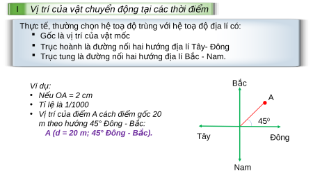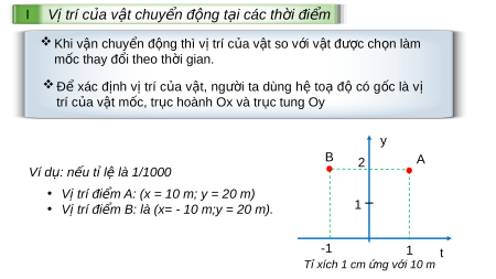 (10m) thì không đư c ợ xem là ch t ấ đi m ể . I Vị trí c a ủ v t ậ chuy n ể đ ng ộ t i ạ các th i ờ đi m ể Khi v n ậ chuy n ể đ ng ộ thì v ịtrí c a ủ v t ậ so v i ớ v t ậ đư c ợ ch n ọ làm m c ố thay đ i ổ theo th i ờ gian. Đ ể xác đ nh ị v ịtrí c a ủ v t ậ , ngư i ờ ta dùng h ệ to ạ đ ộ có g c ố là v ị trí c a ủ v t ậ m c, ố tr c ụ hoành Ox và tr c ụ tung Oy y B A 2 Ví d : ụ n u ế t ỉl ệ là 1/1000 • Vị trí đi m