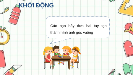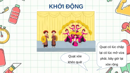 Các bạn hãy đưa hai tay tạo thành hình ảnh góc vuông KHỞI ĐỘNG Quạt có lúc chập lại có lúc mở vừa Quạt xòe phải, bây giờ lại khéo quá! xòe rộng