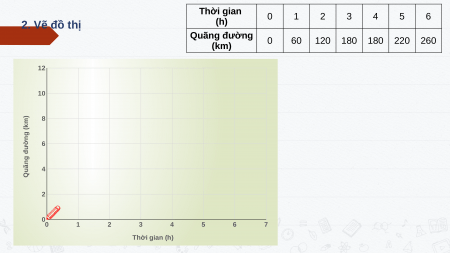 1. Lập bảng ghi quãng đường đi được theo thời gian Thời gian (h) 0 1 2 3 4 5 6 Quãng đường (km) 0 60 120 180 180 220 260 s